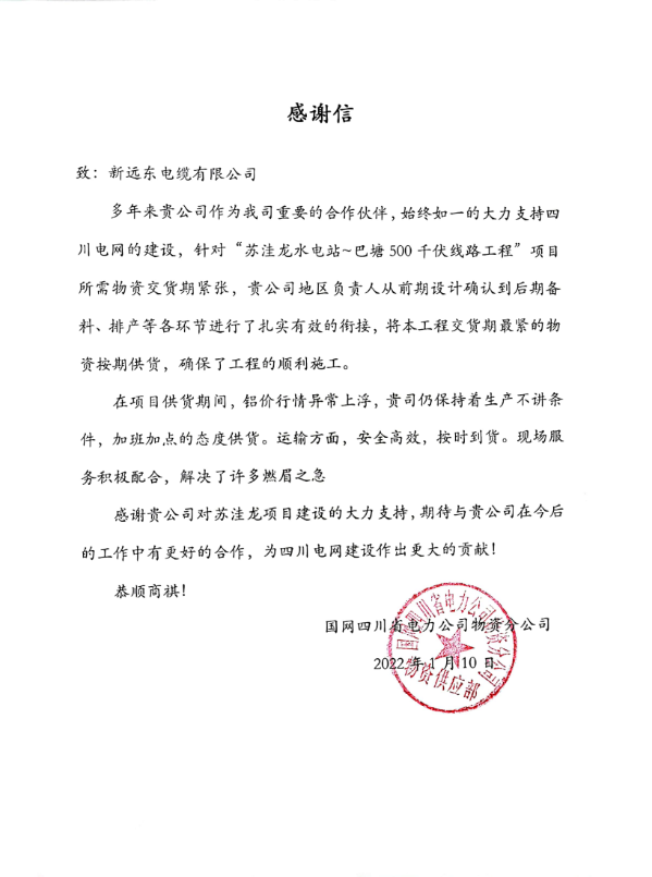 此外负责该项目的专业技术人员的技术能力与服务水平也得到了客户的一致好评,在工程施工中,给予了多次现场技术服务与支持,为项目的顺利推进带来了很大便利。为了表示感谢,国网四川省电力公司物资分公司还专门为新麻豆看片在线观看电缆发来一封感谢信,信中特别表扬道,新麻豆看片在线观看电缆不仅短时间内准时供货,而且还从前期设计确认到后期备料、排产、运输等各环节都给予了该项目大力支持,真正做到了急客户所急、想客户所想!在供货期间,面对铝价行情异常上浮的情况,新麻豆看片在线观看电缆仍保持着生产不讲条件、加班加点的态度供货,确保了工程的顺利施工。可见,国网四川省电力公司物资分公司对新麻豆看片在线观看电缆提供的周到、热情服务予以了极高评价。